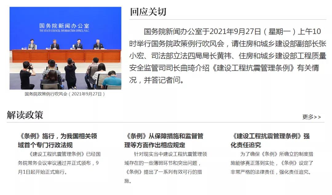 [国务院新闻办新闻局副局长、新闻发言人 邢慧娜]各位媒体朋友们,大家上午好,欢迎出席国务院政策例行吹风会。《建设工程抗震管理条例》已经国务院常务会议审议通过并正式颁布,9月1日起开始正式施行。今天的吹风会主要向大家介绍《条例》的有关情况。出席今天吹风会的是:住房和城乡建设部副部长张小宏先生;司法部立法四局局长黄祎先生;住房和城乡建设部工程质量安全监管司司长曲琦先生。首先,请张小宏先生作简要的情况介绍。2021-09-27 10:02:59